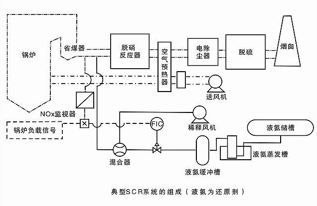 SCR脱硝工艺系统可分为液氨储运系统(液氨为还原剂)、氨气制备和供应系统、氨/空气混合系统、氨喷射系统、烟气系统、SCR反应器系统和氨气应急处理系统等。