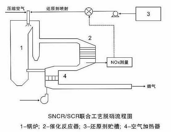 SNCR/SCR联合工艺是将SNCR技术与SCR技术联合应用,即在炉膛上部850~1100℃的高温区内,以尿素等作为还原剂,还原剂通过计量分配和输送装置准确分配到每个喷枪,然后经过喷枪喷入炉膛,实现Nox的脱除,过量逃逸的氨随烟气进入炉后装有少量催化剂的SCR脱硝反应器,实现二次脱硝。